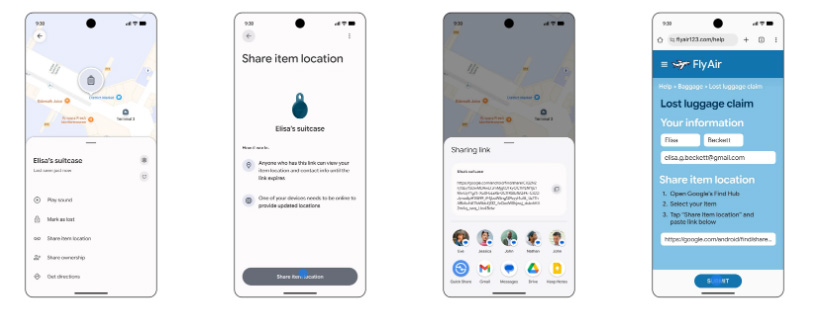 Η Google ανακοίνωσε την προσθήκη της λειτουργίας «Share Item Location» (Κοινή χρήση τοποθεσίας αντικειμένου), με μοναδικό σκοπό να διευκολύνει το έργο των τμημάτων παραλαβής αποσκευών. Πλέον, το Find My Device δεν ενημερώνει απλώς τον κάτοχο για το πού βρίσκεται η βαλίτσα του, αλλά επιτρέπει τη δημιουργία ενός ασφαλούς συνδέσμου (link).
