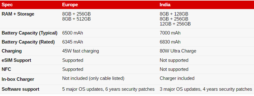 Εδώ έχουμε τα νέα που μάλλον δεν θα σας ενθουσιάσουν. Ενώ οι χρήστες στην Ινδία απολαμβάνουν μια θηριώδη μπαταρία 7.000 mAh, εμείς στην Ευρώπη θα πρέπει να συμβιβαστούμε με 6.500 mAh. Σίγουρα παραμένει μια εξαιρετική χωρητικότητα, αλλά η διαφορά είναι αισθητή. Το ίδιο ισχύει και για την ταχύτητα φόρτισης: Από τα «αστραπιαία» 80W, πέφτουμε στα 45W.