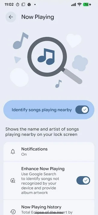 Για να αποκτήσει κάποιος πρόσβαση σε αυτή τη λειτουργία, θα πρέπει αρχικά να μεταβεί στις Ρυθμίσεις > Ήχος & δόνηση > Now Playing. Μπορεί στη συνέχεια ο χρήστης να βεβαιωθεί ότι η λειτουργία είναι ενεργοποιημένη κοιτάζοντας το πρώτο κουμπί στη σελίδα, το οποίο θα πρέπει να είναι ενεργοποιημένο. Επίσης, μπορεί ο καθένας να ενεργοποιήσει τη λειτουργία “Enhance Now Playing”, η οποία χρησιμοποιεί την Αναζήτηση Google για να εντοπίσει τραγούδια που η συσκευή του δεν μπορεί να αναγνωρίσει και να παρέχει επίσης εξώφυλλα άλμπουμ.