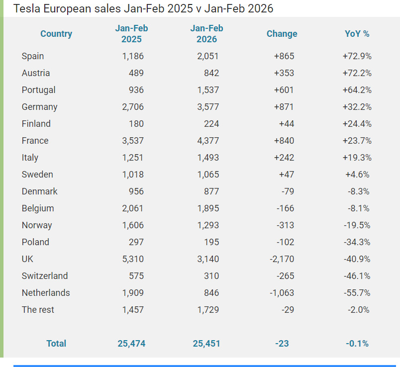 - Οι Απώλειες: Στον αντίποδα, το Ηνωμένο Βασίλειο –κάποτε προπύργιο της Tesla– καταγράφει πτώση 37%. Οι Κάτω Χώρες βυθίστηκαν στο -45%, ενώ ακόμα και η «ηλεκτρική» Σουηδία σημείωσε πτώση 10%.