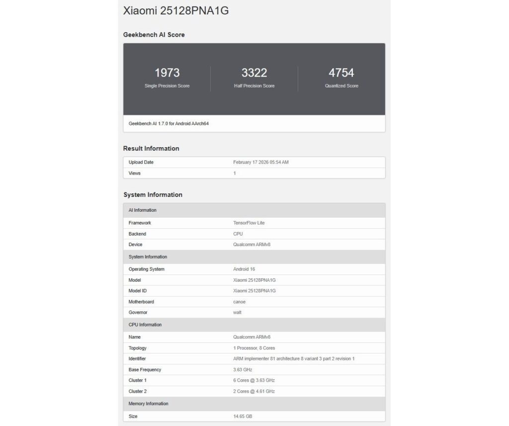 Η πιστοποίηση αποκάλυψε τον κωδικό μοντέλου 25128PNA1G, ο οποίος εμφανίστηκε ήδη στη βάση δεδομένων του Geekbench AI, επιβεβαιώνοντας πως οι επιδόσεις του θα είναι κορυφαίες: